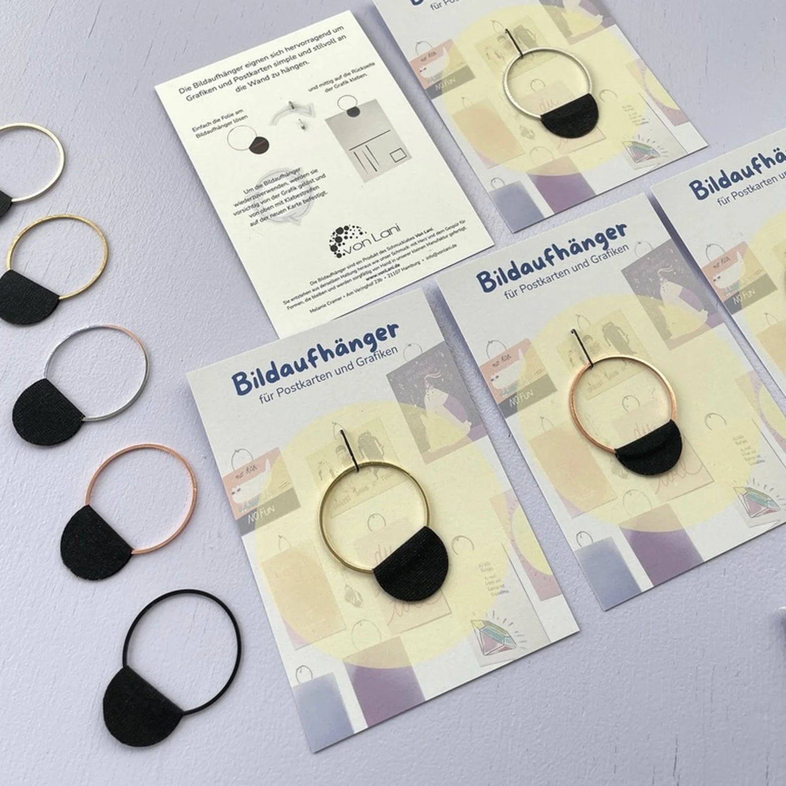 Deze minimalistische beeldophangers met een ringetje van 30 mm maken het eenvoudig om kleine kunstwerkjes, ansichtkaarten of lieve groeten decoratief aan de muur te tonen. Ideaal voor iedereen die papieren momenten verzamelt en zichtbaar wil maken – herinneringen, vondsten van de rommelmarkt of kunst uit je favoriete winkel.