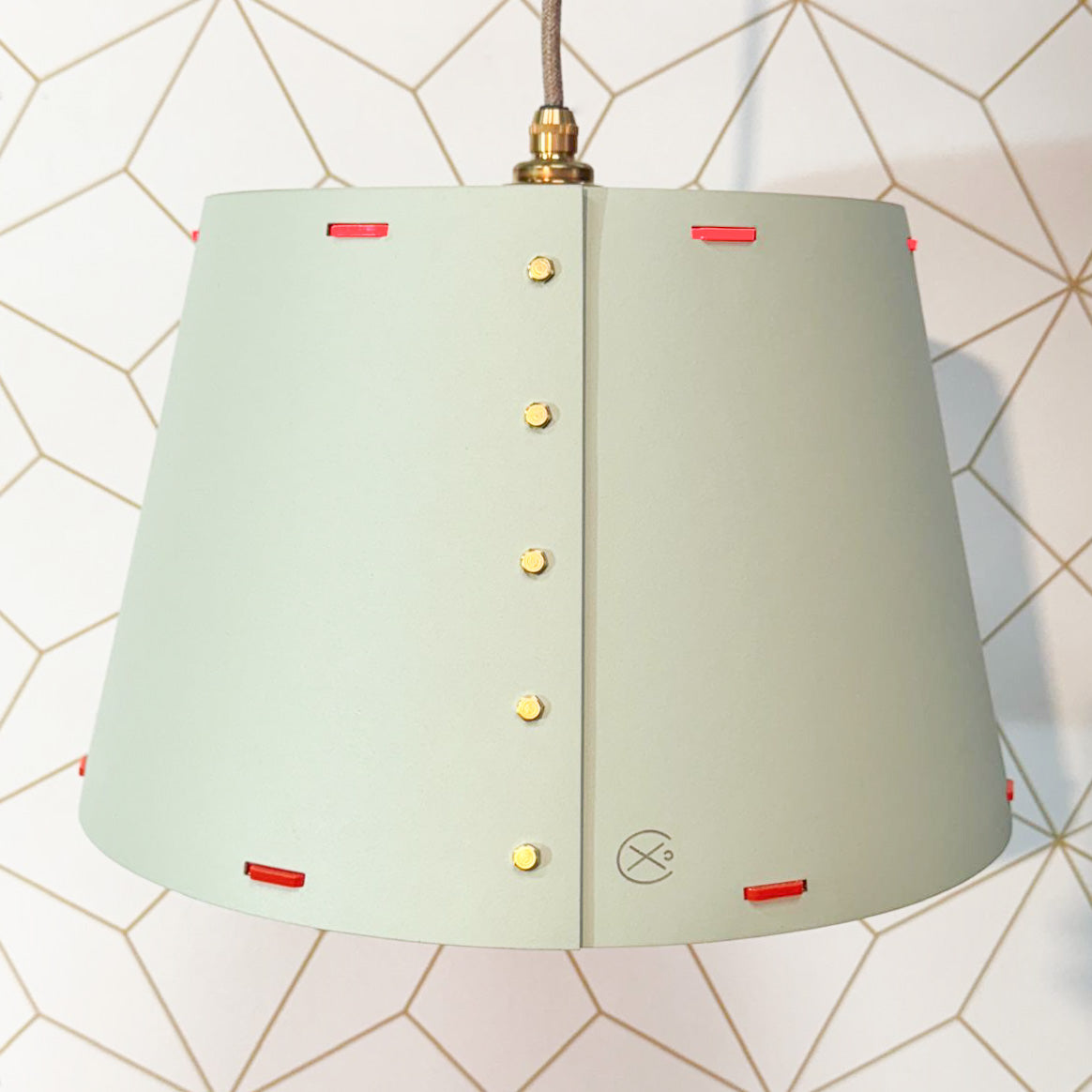 Dit hanglampie is gemaakt van duurzaam linoleum – restmateriaal van tafels en gerecycled plexiglas. Afgewerkt met messing details.