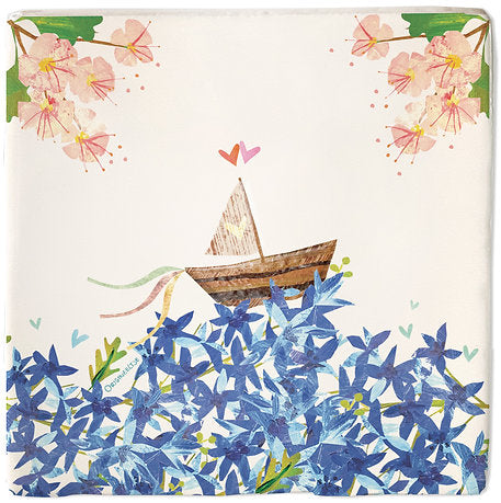 Op dit tegeltje vaart een klein bootje speels over een zee van blauwe Delphiniums.