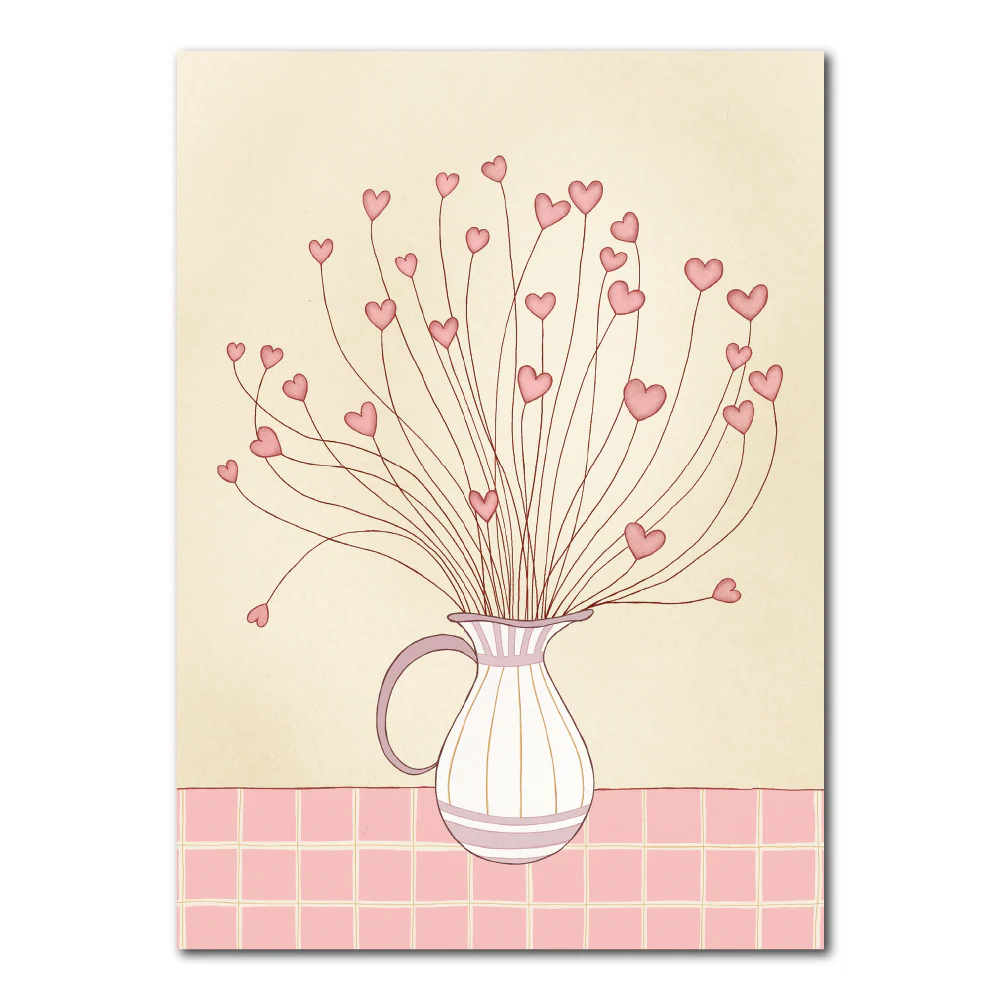 Leuk kaartje om iemand wat liefde te sturen. Leuk voor Valentijn maar ook daarbuiten, zoals een bruiloft of verloving. Op de kaart staat een mooie kan, gevuld met allemaal roze hartjes op stelen. De kaart heeft zachte kleuren.