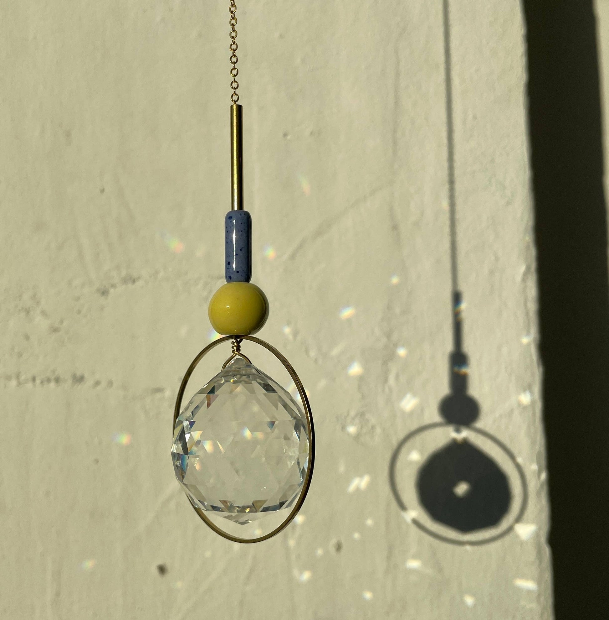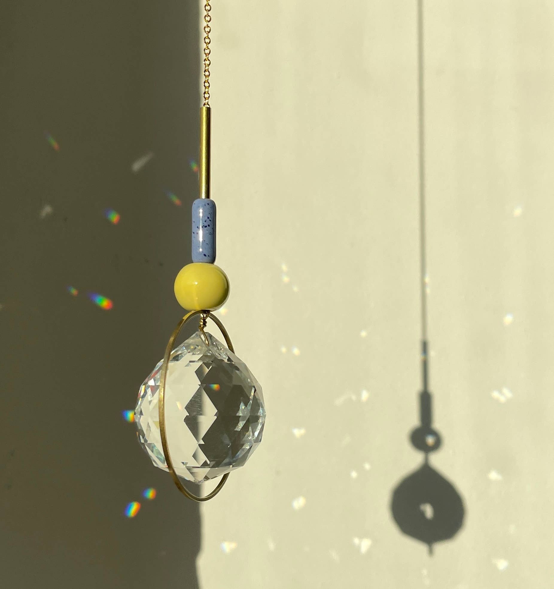 Deze variant draagt de naam Bubble en combineert een echte glazen kristalkogel met keramische kralen in geel & blauw. De kleuren stralen warm en vriendelijk speels, licht en kleurverliefd. Het fonkelende prisma wordt vastgehouden door een delicate messingketting, die eenvoudig met een haak kan worden bevestigd – of het nu aan het raam, in de kinderkamer of in de tuin is. Ook zonder zon blijft de lichtvanger een stijlvolle blikvanger.