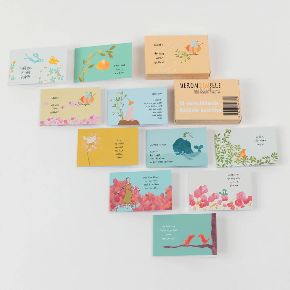 De kaartjes zijn gedrukt op 300 grs gerecyceld karton van (dubbel) 5,5 x 8,5 cm