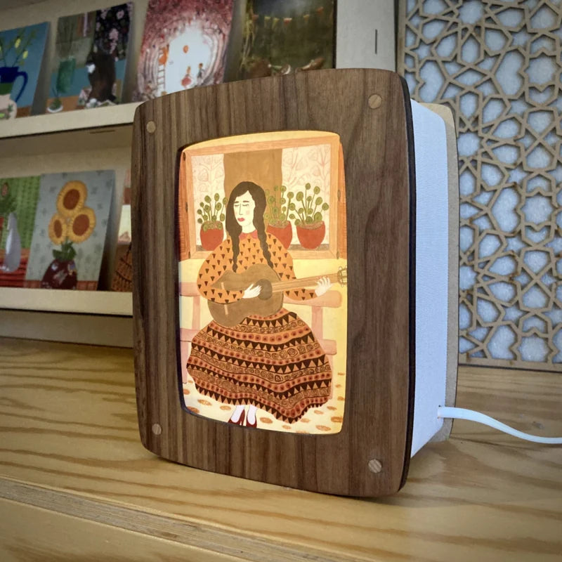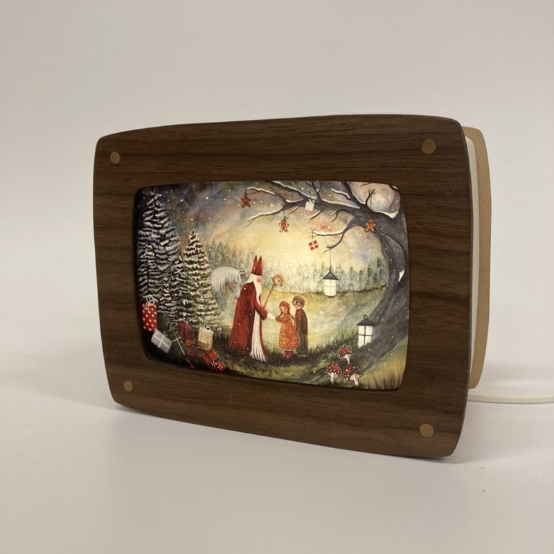 Dit lampje heeft een frontje van geolied walnoothout en is rondom omspannen met stof. In combinatie met een kaart naar keuze, maak je van je favoriete kaart een luxe sfeerlampje.
