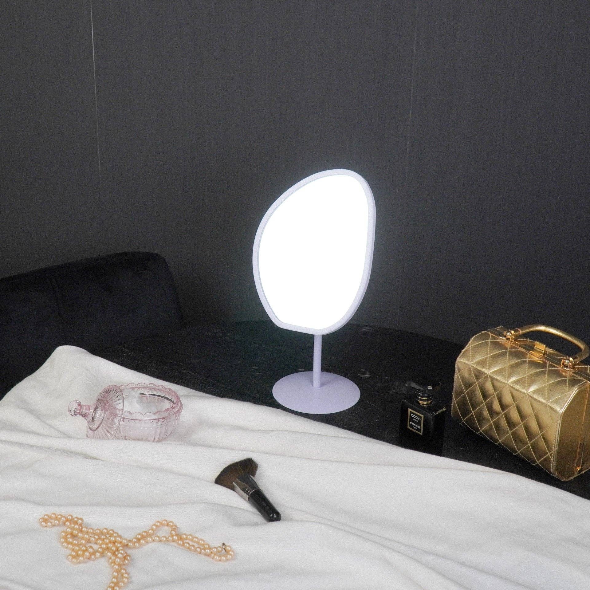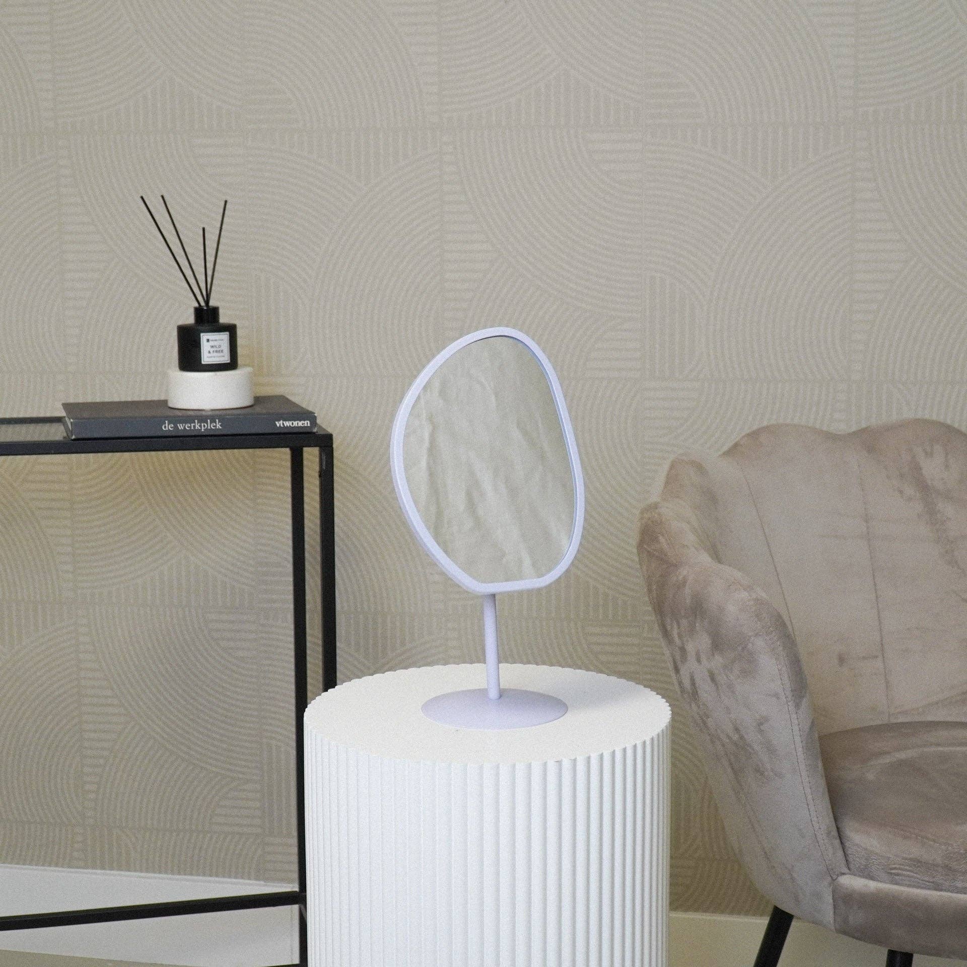 Deze staande spiegel heeft een organische vorm en een metalen frame in lila.